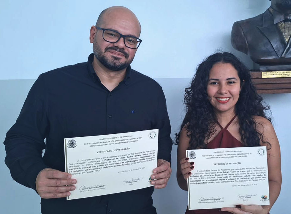 Na ocasião, a professora substituta do curso de Design Anna Tainah Tárrio de Paula, egressa do curso de graduação e do programa de pós-graduação de Design/UFAM, recebeu uma homenagem pela sua dissertação. Intitulada “Preservação de patrimônio cultural com auxílio de tecnologias de prototipagem rápida e colagem de barbotina: um estudo com cerâmicas da fase Guarita”, teve orientação do professor Dr. José Carlos Calado Sales Junior e coorientação da professora Dra. Sheila Cordeiro Mota.